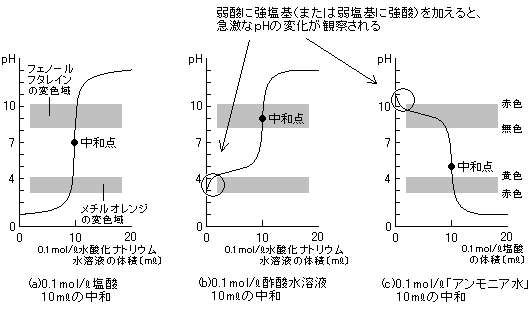酸―塩基の滴定→指示薬…フェノールフタレイン・メチルオレンジ